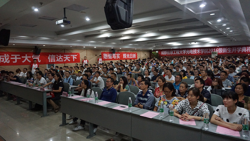 【本网讯】为帮助新生尽快适应大学生活、转变角色,9月8日晚,光电技术学院在学术报告厅隆重举行2016级新生开学典礼。党总支书记王嵩、院长朱兴华、副院长杨定宇、党政办、学工办、专业教研室、实验室主任以及全体辅导员出席典礼。2016级306名新生及家长代表参加了开学典礼,典礼由学工办主任童强主持。