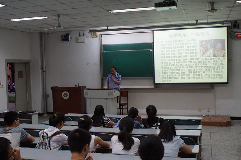 6月23日晚,学校邀请双流区公安分局禁毒大队警官王成元在航空港校区学术报告厅为师生作了一场禁毒知识专题讲座。王警官用大量的数据和图片资料向大家介绍了毒品的相关知识,用生动的案例讲解了吸食毒品对人体的危害。现场师生踊跃提问,在互动中师生进一步增强了对毒品的认识。