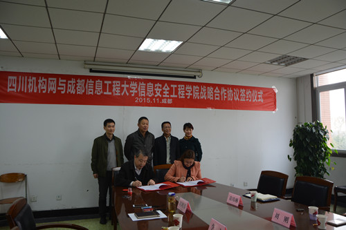 【本网讯】近日,信息安全工程学院与四川机构网战略合作协议签订仪式在乐动举行。四川省互联网协会副理事长兼秘书长刘刚、成都绿之蓝科技有限公司总经理苏乾凤、副总苗玮琳以及信息安全工程学院院长李飞、党总支书记许鸿涛等参加了签约仪式。