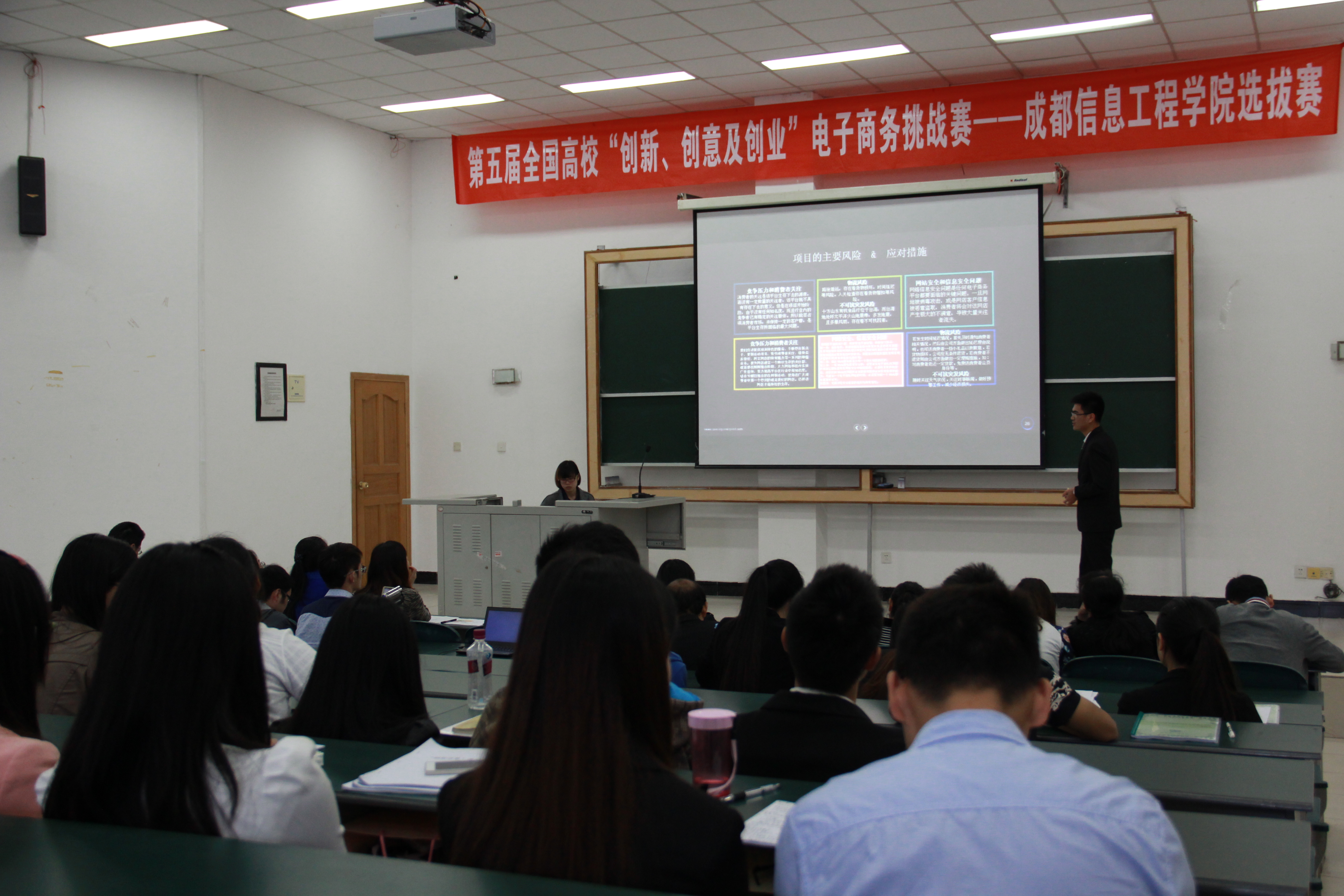 【本网讯】4月12日早9时,由我院物流学院和成都信息工程学院大学科技园(成都研究院)共同承办的第五届全国高校“创新、创意及创业”电子商务挑战赛——成都信息工程学院校级选拔赛在龙泉校区3101教室隆重举行。截止目前为止,我院共有50多支学生团队报名参加全国高校电子商务“三创赛”,是全省报名最多的一所学校。在校级选拔赛上,这些团队进行了精彩演讲和答辩,他们来自全校各个学科和专业,包括电子商务、物流管理、物流工程、市场营销、旅游管理、会计学、艺术设计、信息管理与信息系统、计算机应用、环境工程、自动化、软件工程、光电科学等专业的学生,首次实现跨校区融合参与的可喜局面。物流学院电子商务教研室全体老师亲临现场担任评委。