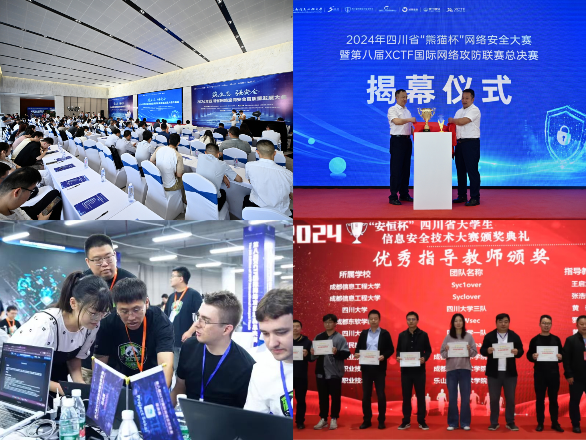 学院始终坚持“以赛促教、以赛促学”的育人理念,通过多层次教学改革和竞赛驱动,全面提升学生的专业能力与创新实践水平。2024年,承办第八届XCTF国际网络攻防联赛总决赛,吸引了来自全球各地的顶尖网络安全高手,展开了一场激烈而精彩的技术较量;成功举办“安恒杯”四川省大学生信息安全技术大赛,吸引全省多所高校参与;组织学生参加“互联网+”、ISCC等国家级与省级赛事,斩获国家级一等奖15项、二等奖28项、三等奖18项,省级奖项57项,多位教师获评优秀指导老师。