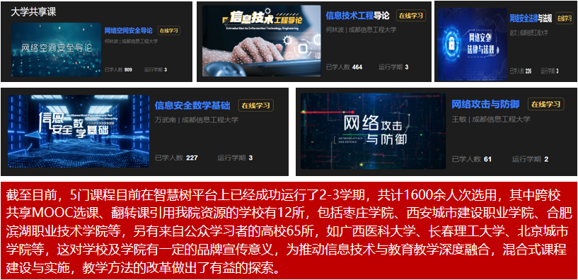 此外,《信息工程技术导论》《网络空间安全导论》等5门课程上线智慧树平台,以共享课、翻转课形式面向社会和高校开放。上线半年,共计服务1600余人次,跨校使用高校达12所,有力促进了教学资源共享与学院品牌传播。这些举措推动了信息技术与教学深度融合,为教育教学模式创新提供了重要参考。
