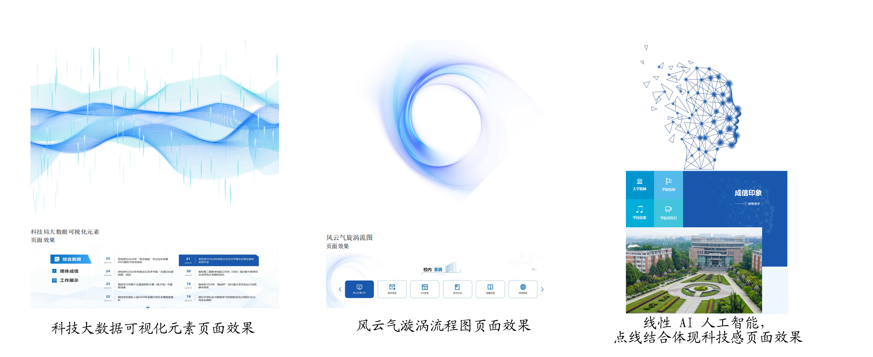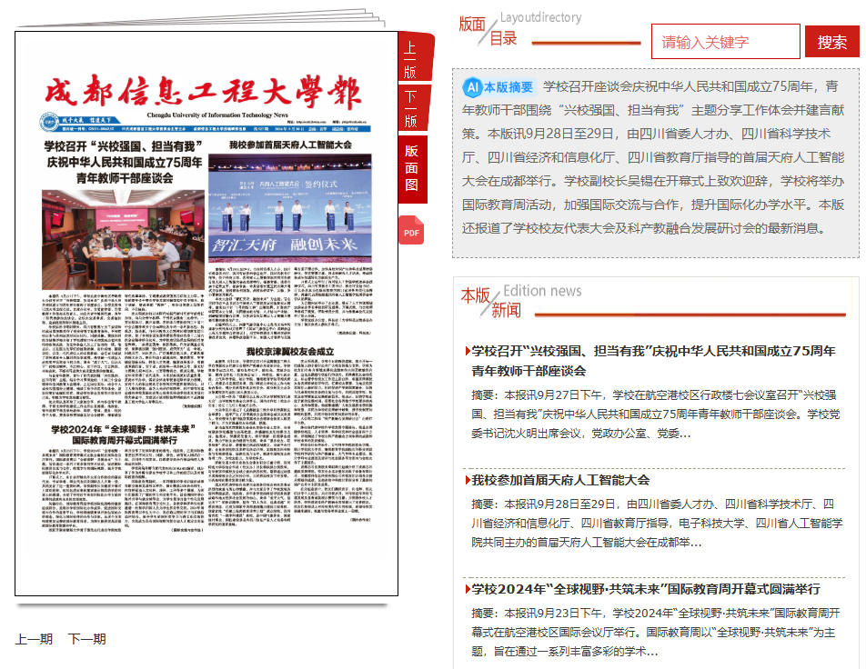 成信要闻采用大图展示学校重点工作、教学科研进展、局校合作、校地合作等工作动态,增强新闻展示视觉效果,提升浏览网页体验感。各栏目融入精致的学校标志性建筑剪影,以“成信+”的栏目名称彰显成信精神内核,展示成信要闻、学术科研、大学文化、师生校友风采、成信融媒等特色栏目。