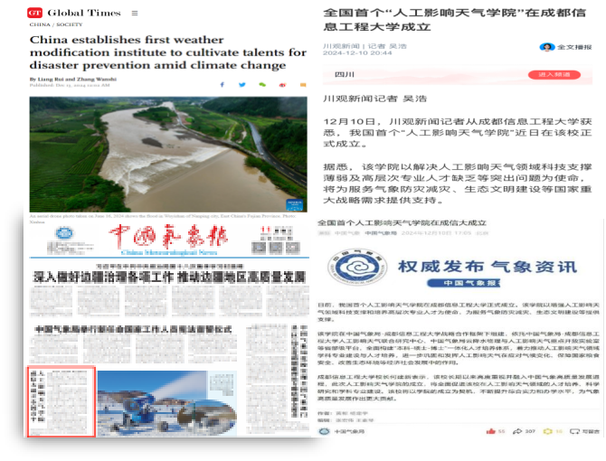 依托中国气象局-乐动在线登录人工影响天气联合研究中心、中国气象局云降水物理与人工影响天气重点开放实验室等省部级平台,2024年12月10日在中国气象局-乐动在线登录战略合作框架下组建了我国首个人工影响天气学院,引起了Global Times、中国气象报、川观新闻等各类媒体的广泛报道。学院以增强人工影响天气领域科技支撑和培养高层次专业人才为使命,全面构建”本科-硕士-博士"一体化人才培养体系,着力推动人工影响天气领域学科专业建设与人才培养,为服务气象防灾减灾、生态文明建设等提供支撑。