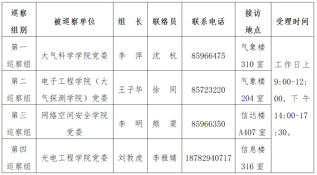 根据《中共乐动在线登录委员会内部巡察工作实施意见》的规定,按照学校党委巡察工作领导小组的统一部署,学校党委巡察组将于2024年10月30日至11月30日,对大气科学学院党委、电子工程学院(大气探测学院)党委、网络空间安全学院党委、光电工程学院党委开展巡察工作。现将有关事宜公告如下: