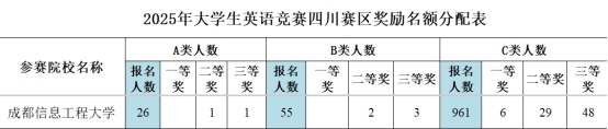 4月13日,乐动2025年全国大学生英语竞赛初赛赛点分别在航空港与龙泉校区顺利举行。乐动此次报名参赛人数为1042人,其中C类考生961人,B类考生55人,A类考生26人。根据全国组委会对奖励等级以及获奖名额的规定,乐动各类考生的获奖名额如下图所示: