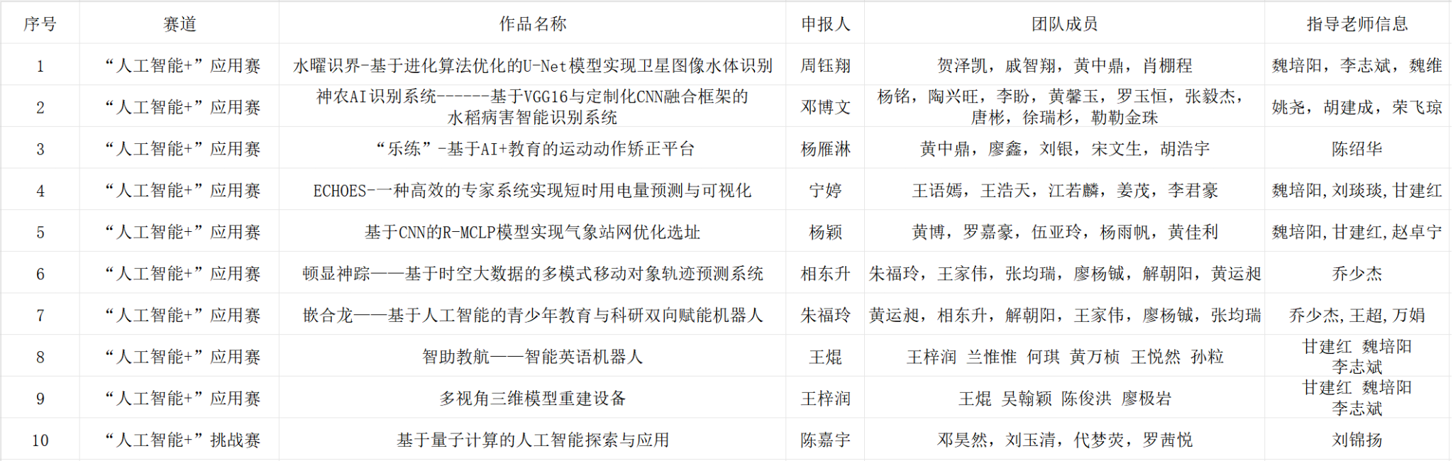 根据《关于开展第十九届“挑战杯”全国大学生课外学术科技作品竞赛的通知》等上级团组织工作要求,经过团队申报、学校审核,乐动共10件作品拟推荐参加第十九届“挑战杯”全国大学生课外学术科技作品竞赛“人工智能+”专项赛,现对项目名单予以公示,名单如下: