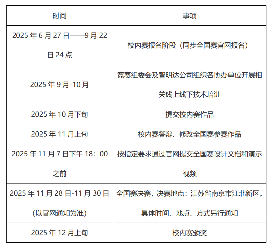 校内赛及全国赛报名截止时间:2025年9月22日24:00。注意除通过填写并提交在线报名表(https://jsj.top/f/oJ7poY)以外,还务必于报名截止时间前通过竞赛网站(www.fpgachina.cn)完成报名工作,逾期截止。