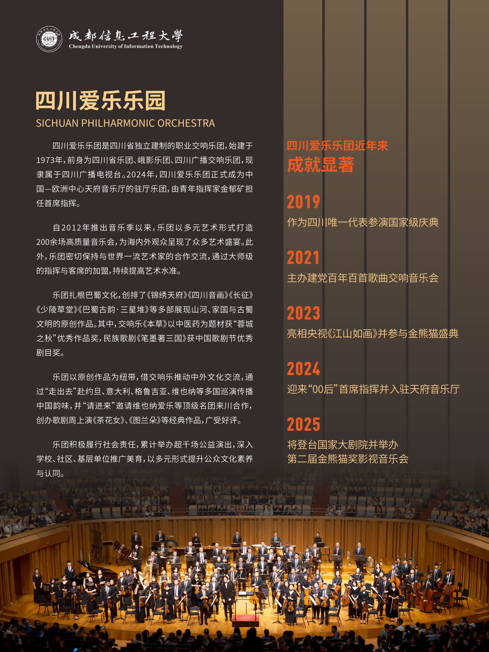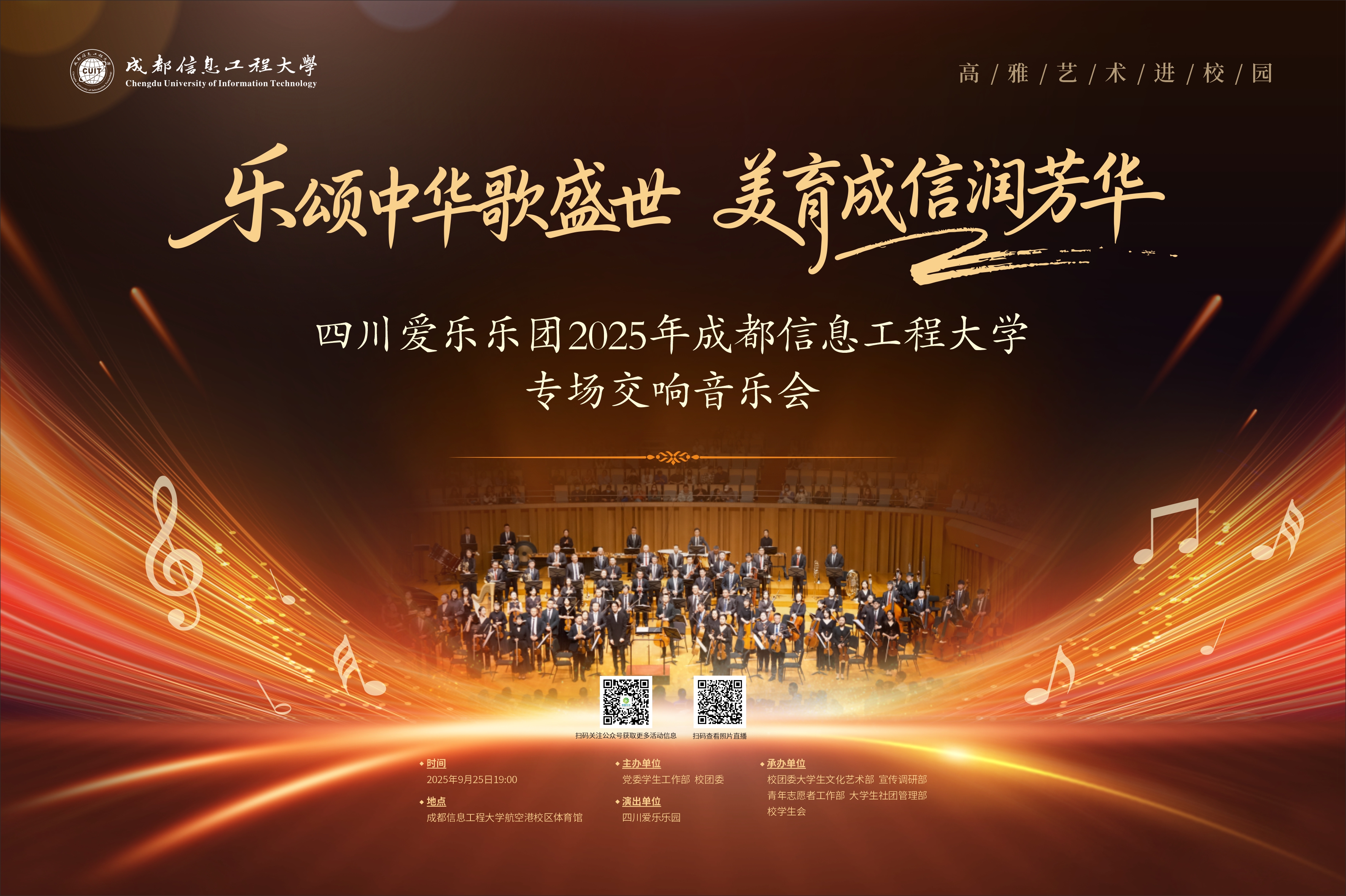 为弘扬中华美育精神,丰富校园文化生活,提升师生艺术素养,感受高雅艺术的独特魅力,乐动特邀四川爱乐乐团走进校园,举办“乐颂中华歌盛世,美育成信润芳华”专场交响音乐会。届时,艺术家们将用精湛的技艺和饱满的热情,为我们奏响时代华章。精彩即将上演,诚邀广大师生共赏音乐盛宴!