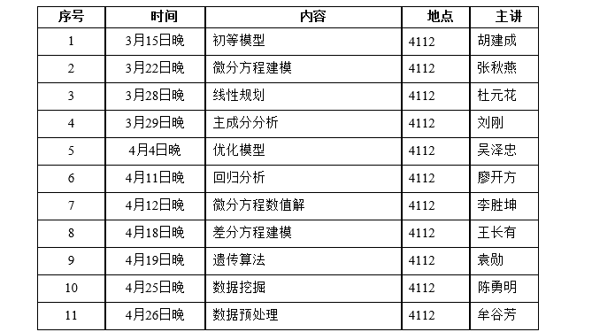 为了培养乐动学生的创新意识及运用数学方法和计算机技术解决实际问题的能力,应用数学学院2023年继续组织和指导大学生数学建模竞赛系列活动,竞赛主要包括:全国大学生数学建模竞赛选拔赛(即五一数学建模竞赛),2023年全国大学生数学建模竞赛,全国高校密码数学挑战赛等。应用数学学院数学建模指导组从第四周开始培训,分别从数学建模基础、数学建模算法、数学建模竞赛、数学建模案例分析到常用软件等方面进行培训,欢迎对数学建模感兴趣的同学积极报名参加培训,培训安排见下表。