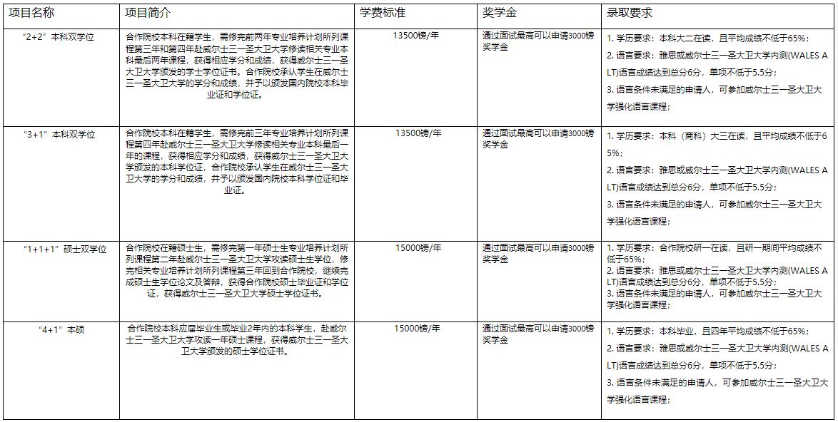 西南学院开设有丰富的项目合作,其中包括:“2+2”双本科学位、“3+1”双本科学位项目、“1+1+1”双硕士学位项目、“4+1”单硕士学位项目、“3+1+1”单硕士学位项目、博士项目、短期实训项目、“HND 专升本” 、来华留学生“2+2”本科项目。