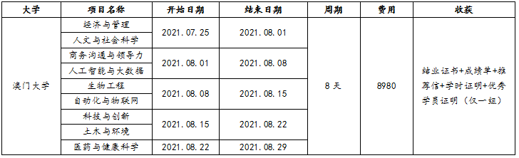 为了让乐动学生拥有更多国(境)外交流学习的机会,更好地参与企业实践活动,学校2021年暑期推出澳门大学访学项目,面向全校同学开放,欢迎同学们积极报名。根据目前国家疫情防控相关政策,进出澳门地区不需要隔离。为了鼓励更多同学参加项目,凡参加项目且获得结业证书的优秀学生均可获得1000元奖学金支持(项目圆满完成后发放)。