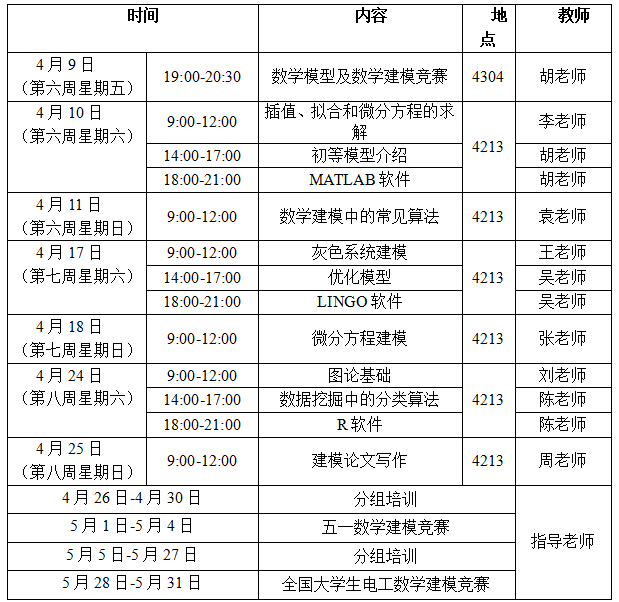 为了培养乐动学生的创新意识及运用数学方法和计算机技术解决实际问题的能力,应用数学学院2021年继续组织和指导大学生数学建模竞赛系列活动,并从五一数学建模竞赛和全国大学生电工数学建模竞赛的获奖队伍中选拔2021年全国大学生数学建模竞赛的参赛队伍。为了参赛同学能在选拔赛中取得优异成绩,应用数学学院数学建模指导组从第六周开始,分别从数学建模基础、数学建模算法、数学建模案例分析以及常用数学软件等方面进行培训,欢迎对数学建模及数学建模竞赛感兴趣的同学积极参加培训,培训安排见表1。
