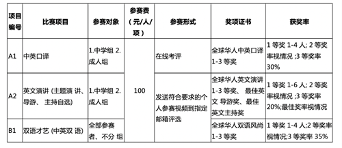 5) 奖项:组内1-3 等奖。奖项证书“第十届全 球华人口译演讲风尚大赛中英口译 1-3 等奖”。
