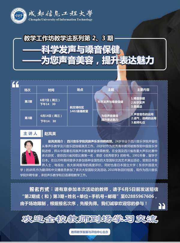 为帮助乐动教师掌握科学发声与嗓音保健的技巧,提升表达魅力,学校教师教学发展与评估中心将开展两场“教学工作坊”教学法系列活动,我们诚挚欢迎您的参与!活动安排如下: