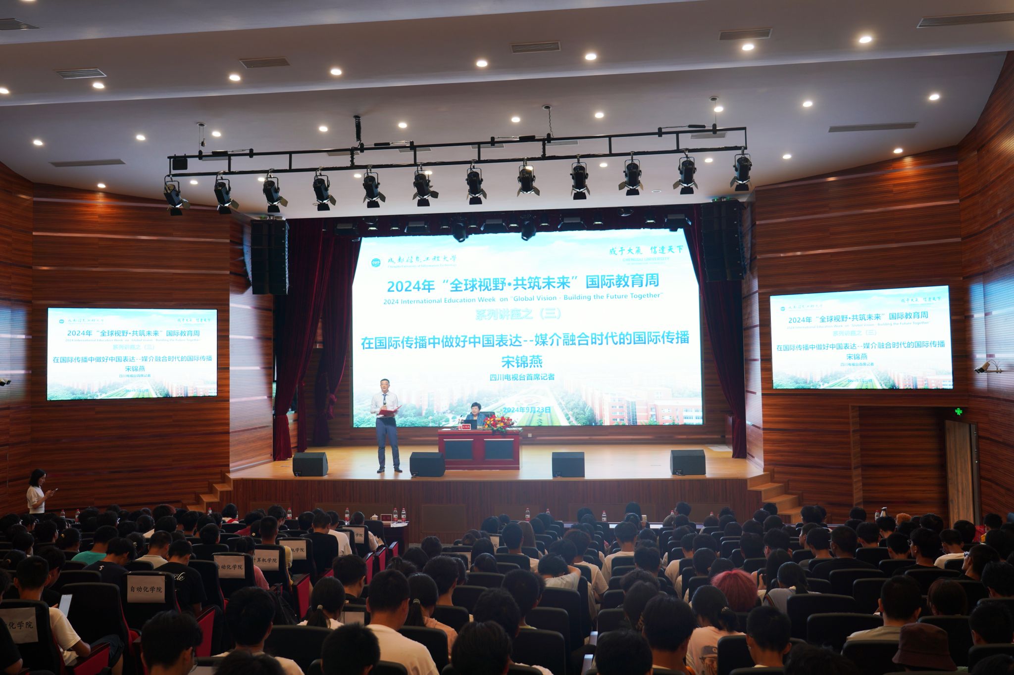 【本网讯】9月23日下午,由国际交流合作处主办的2024年“全球视野·共筑未来”国际教育周系列讲座活动在航空港校区探测楼大礼堂举办。四川电视台二级首席记者宋锦燕应邀为航空港校区五百余名师生带来了题为“在国际传播中做好中国表达——媒介融合时代的国际传播”的学术报告。活动由学校副校长吴锡主持。