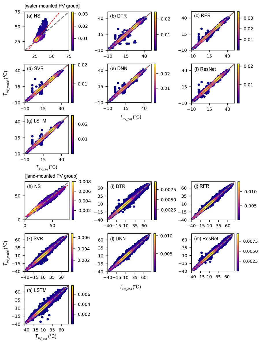 针对上述科学问题,近日乐动在线登录大气科学学院李培都博士在中科院1区Top期刊《Renewable Energy》(IF:9.0)上发表了一篇题为“Advancing photovoltaic panel temperature forecasting: a comparative study of numerical simulation and machine learning in two types of PV power plant”的研究论文。该研究对湖、陆光伏电站的光伏面板温度预测进行了比较,探讨了数值模拟与机器学习方法在不同条件下的性能表现。基于数值模拟和6种机器学习算法,研究发现,机器学习在光伏面板温度的预测性能优于传统的数值模拟。其原因是数值模拟是基于简化的物理模型,可能不能完全反映所研究系统的复杂性。机器学习更多是基于数据驱动,可更好地解释数据中的非线性和复杂模式。然而,数值模拟仍然具备重要的物理意义,能够为理解潜在的物理过程提供深刻洞见。研究建议,未来可通过混合方法,结合数值模拟与机器学习方法,以实现更加精确的预测,特别是在缺乏训练数据的情况下,数值模拟的重要性不容忽视。这一研究不仅为光伏电站的运维优化提供了科学依据,也为进一步开发高效的预测模型奠定了理论基础,具有重要的应用价值。