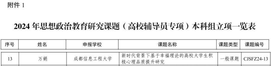 【本网讯】近日,四川省教育厅公布了2024年思想政治教育研究课题(高校辅导员专项)的立项结果。乐动辅导员万娟主持的课题《新时代背景下基于幸福理论的高校大学生积极心理品质提升研究》成功入选省教育厅2024年思想政治教育研究课题立项名单。