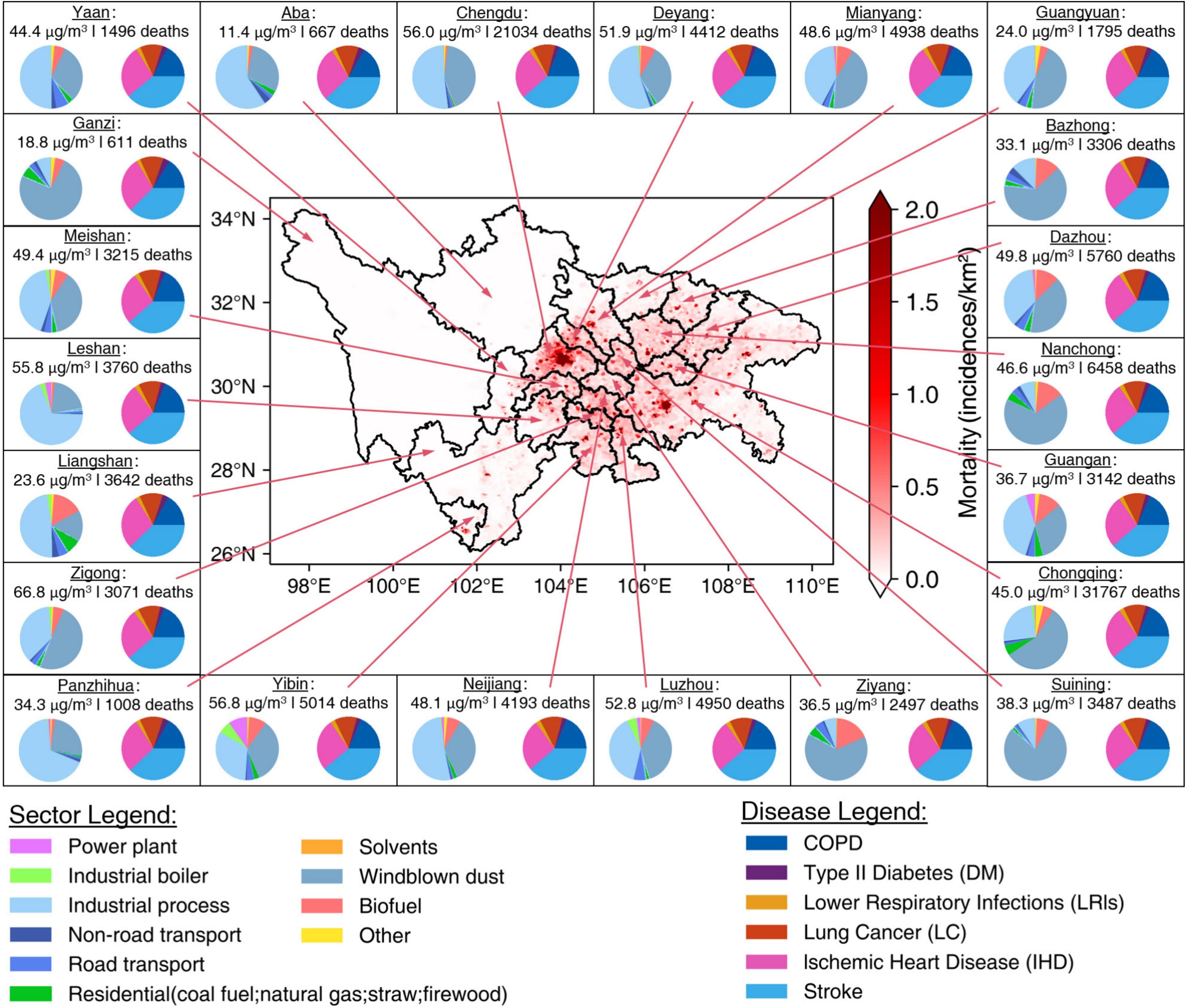 Figure 1. Sector-based PM2.5 emissions and absolute ambient PM2.5 mortality burden and disease contributions for the SCB in 2017. (Note: The left pie charts are fractional sectoral source contributions of PM2.5 emissions, and the right pie charts are relative disease contributions quantified by the revised GEMM model.)