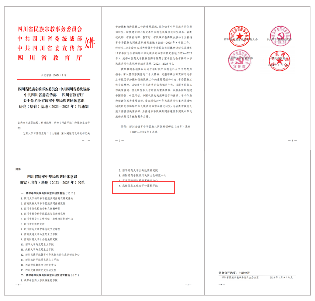 【本网讯】为贯彻落实习近平总书记在中央政治局第九次集体学习时的重要讲话精神,夯实铸牢中华民族共同体意识的理论基础,四川省委统战部、省委宣传部、省教育厅、省民族宗教委日前联合印发《关于命名全省铸牢中华民族共同体意识研究(培育)基地(2023—2025年)的通知》,决定命名全省首批铸牢中华民族共同体意识研究(培育)基地,乐动计算机学院被命名为四川省铸牢中华民族共同体意识研究培训基地,位列首批基地之一,是本次被命名单位中唯一一个技术型基地。