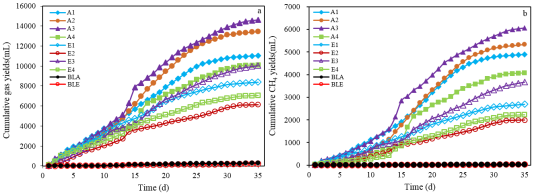 图1 不同基质比例时添加和未添加凹凸棒土条件下的累积产气量:(a)添加凹凸棒土;(b)未添加凹凸棒土