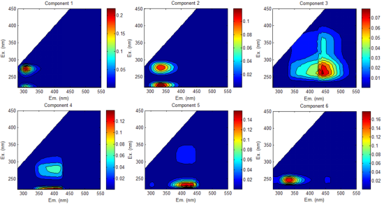结果表明,添加凹凸棒土(A1-A4)可以显著增加沼气的产量,底物产气量和挥发性固体产气量均比不添加凹凸棒土(E1-E4)时高。平行因子分用于识别发酵过程中DOM荧光组分,显示添加凹凸棒土的发酵液中荧光组分强度明显高于未添加凹凸棒土的荧光组分,这些荧光DOM成分在厌氧消化过程中有机物的转化中发挥了极其重要的作用,特别是类蛋白质组分。同时,研究借助二维相关光谱(2D-COS)方法探究添加和不添加凹凸棒土条件下荧光组分和官能团变化的优先顺序对沼气的产生和有机物降解的影响。研究指出,凹凸棒土中多种微量元素(Fe3+、Al3+、Ca2+和Mg2+)和较大的比表面积促进产甲烷细菌的生长,加快甲烷生成的进程,有利于DOM的转化,从而增加沼气和甲烷的产量。