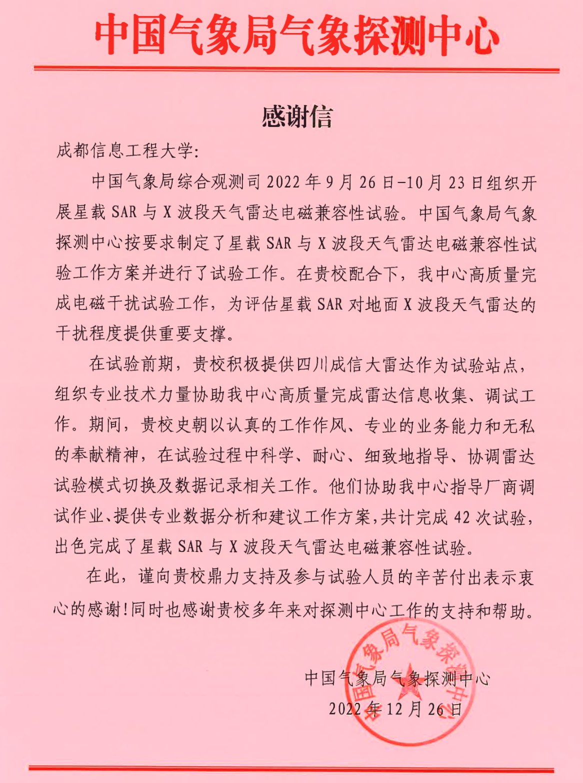 【本网讯】近日,乐动收到中国气象局气象探测中心发来的一封感谢信,就乐动电子工程学院副院长史朝协助工作、出色完成星载SAR与X波段天气雷达电磁兼容性试验表示感谢。感谢信详细内容如下: