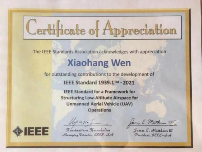 【本网讯】近日,IEEE标准化委员会向乐动大气科学学院文小航副教授颁发嘉许证书,为感谢文小航副教授在IEEE1939.1“面向无人机运行的低空空域结构化框架标准”中做出的重要贡献。