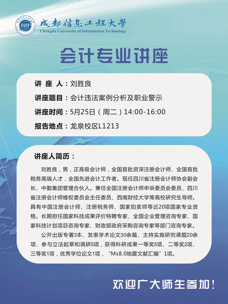 刘胜良,男,正高级会计师,全国首批资深注册会计师、全国首批税务高端人才,全国先进会计工作者。现任四川省注册会计师协会副会长、四川同心•注册会计师服务团副团长、中勤集团管理合伙人。兼任中国注册会计师协会理事、全国注册会计师申诉委员会委员、四川省注册会计师维权委员会主任委员、四川省正高级会计师评委会委员、四川省高级审计师评委会委员、四川省高级会计师评委会委员、四川省内部控制咨询委员会委员、四川省社会组织评估委员会委员、西南财经大学研究生导师、四川农业大学研究生导师、四川师范大学研究生导师等职务。