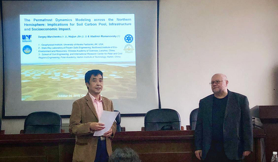 马尔琴科教授对我院的邀请表示了诚挚的感谢。他围绕永久冻土的研究动机和目标展开,分析了其近期变化趋势,并在此基础上详细解释了地球物理研究所多年冻土实验室模型(The Geophysical Institute Permafrost Laboratory model,GIPL),利用此模型研究阿拉斯加、中亚乃至整个北半球永久冻土未来可能发生的变化和对阿拉斯加碳库的影响,估算出了永久冻土解冻现象对社会经济产生的影响。