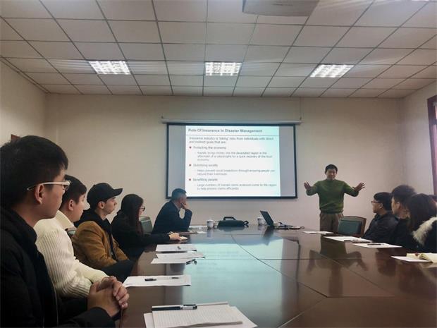 上午,沈博士在气象楼会议室给大气科学学院部分师生及与乐动有合作关系的企业代表做了题为”Weather Hazard. Insurance, Reinsurance, Today and Tomorrow”(大气科学在保险再保险行业中的应用及发展)的专业学术报告。沈博士在报告中介绍了气象灾害活动带给人们的影响,罗列了巨灾的种类以及造成的损失,并着重说明了巨灾导致的情感伤害。此外,他对构建风险模型做了细致讲解,针对它所必须的四个重要因素一一说明,并以实例讲解了当保险公司不能承担风险金额时再保险公司在其中起到的作用。最后,他就目前巨灾模型的发展水平做了总结。