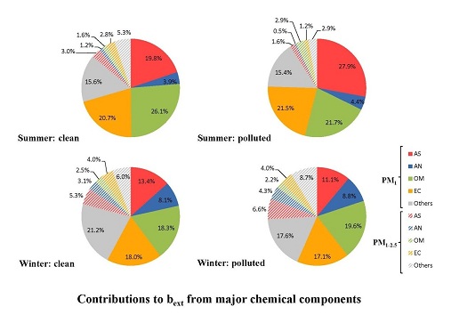 课题研究发现,夏季污染发生时,气团从海洋输送转变为局地输送,PM1在PM2.5中的比例从77%增长到82%,PM1对消光的贡献从86%增加到91%,主要表现为PM1中硫酸盐、硝酸盐和元素碳对消光贡献的增加以及有机物对消光贡献的减少;冬季污染发生时,气团从东北内陆逐渐转变为向东南沿海发展,PM1在PM2.5中的比例从66%下降到61%,PM1对消光的贡献从79%下降到到74%,主要表现为PM1-2.5中硫酸盐、硝酸盐对消光贡献的增加以及有机物对消光贡献的减少。