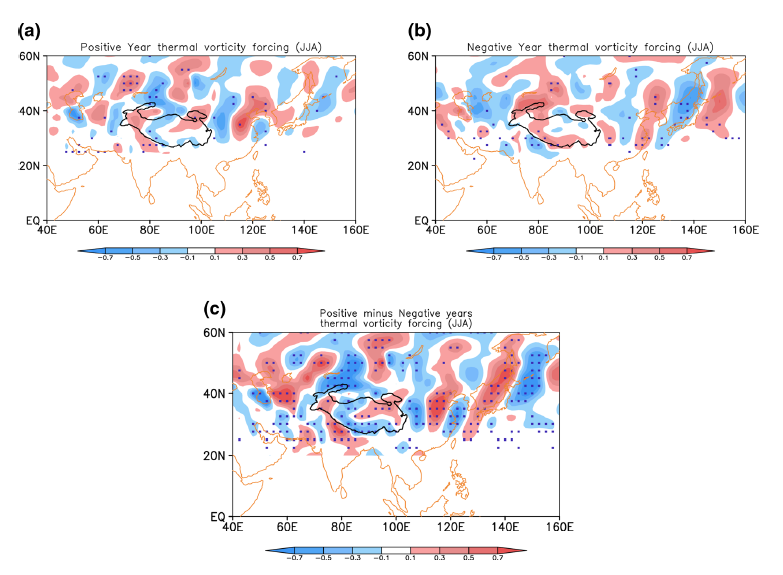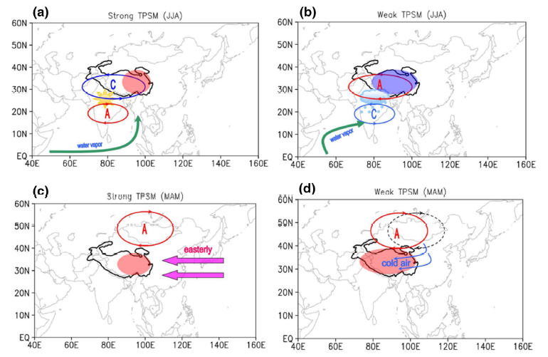 该研究从高原夏季风年际变率异常的角度出发,发现强(弱)青藏高原夏季风对高原地区以及印度北部的夏季降水有非常显著的影响,同时发展了一个用于解释高原夏季风的形成的热力涡度方程,进而说明了高原夏季风的形成主要是受到高原的热力作用而不是地形强迫(non-orographic effects)的影响。文章最后还指出高原春季地表非绝热加热异常以及蒙古反气旋的位置变化与强(弱)高原夏季风的形成有着重要的联系。该研究结果为深入理解高原季风年际变化规律提供了相应的理论支持,也对今后开展高原季风的数值模拟研究计划有着重要意义。
