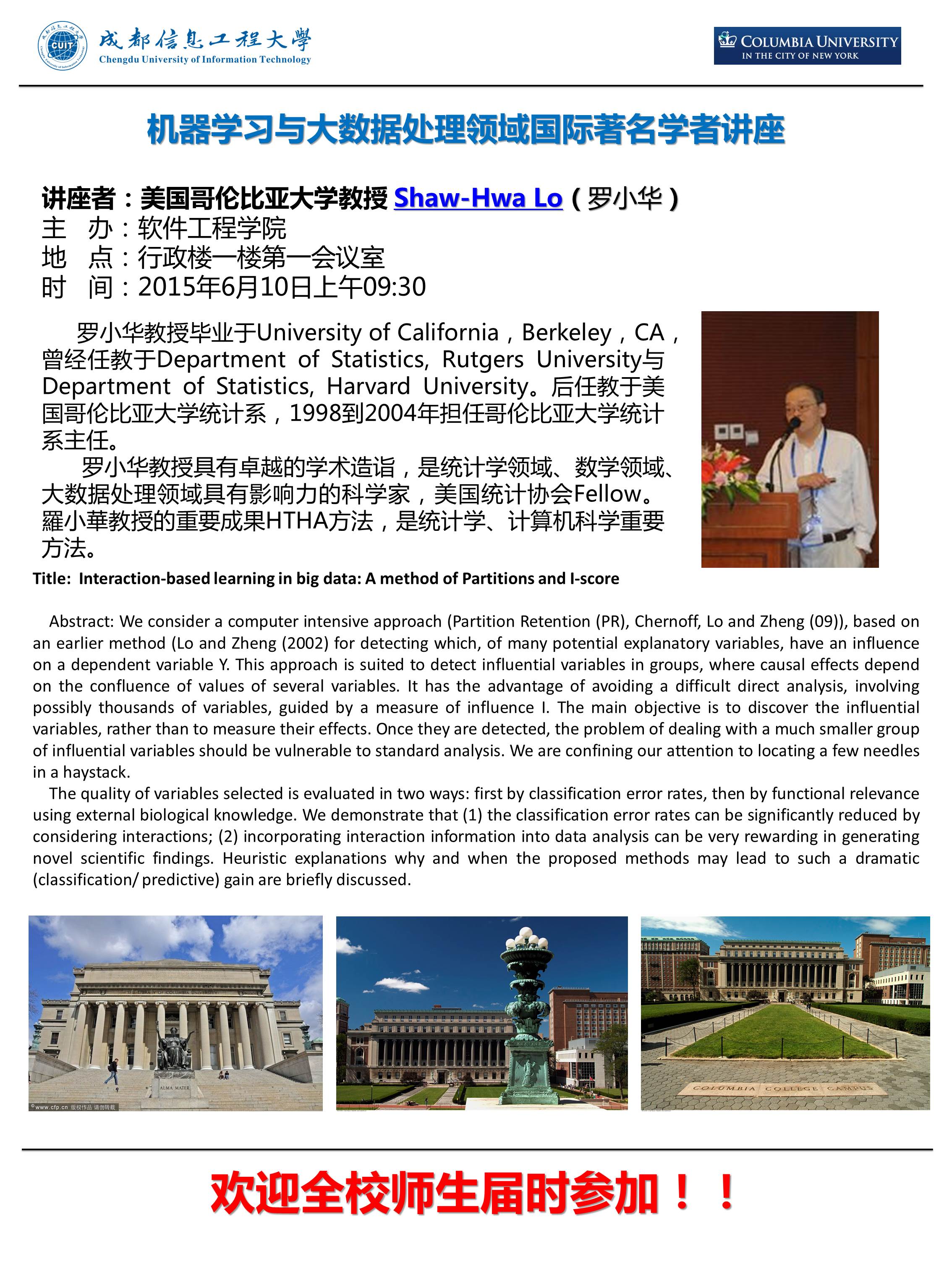学术预告:美国哥伦比亚大学教授 Shaw-Hwa Lo到校讲学