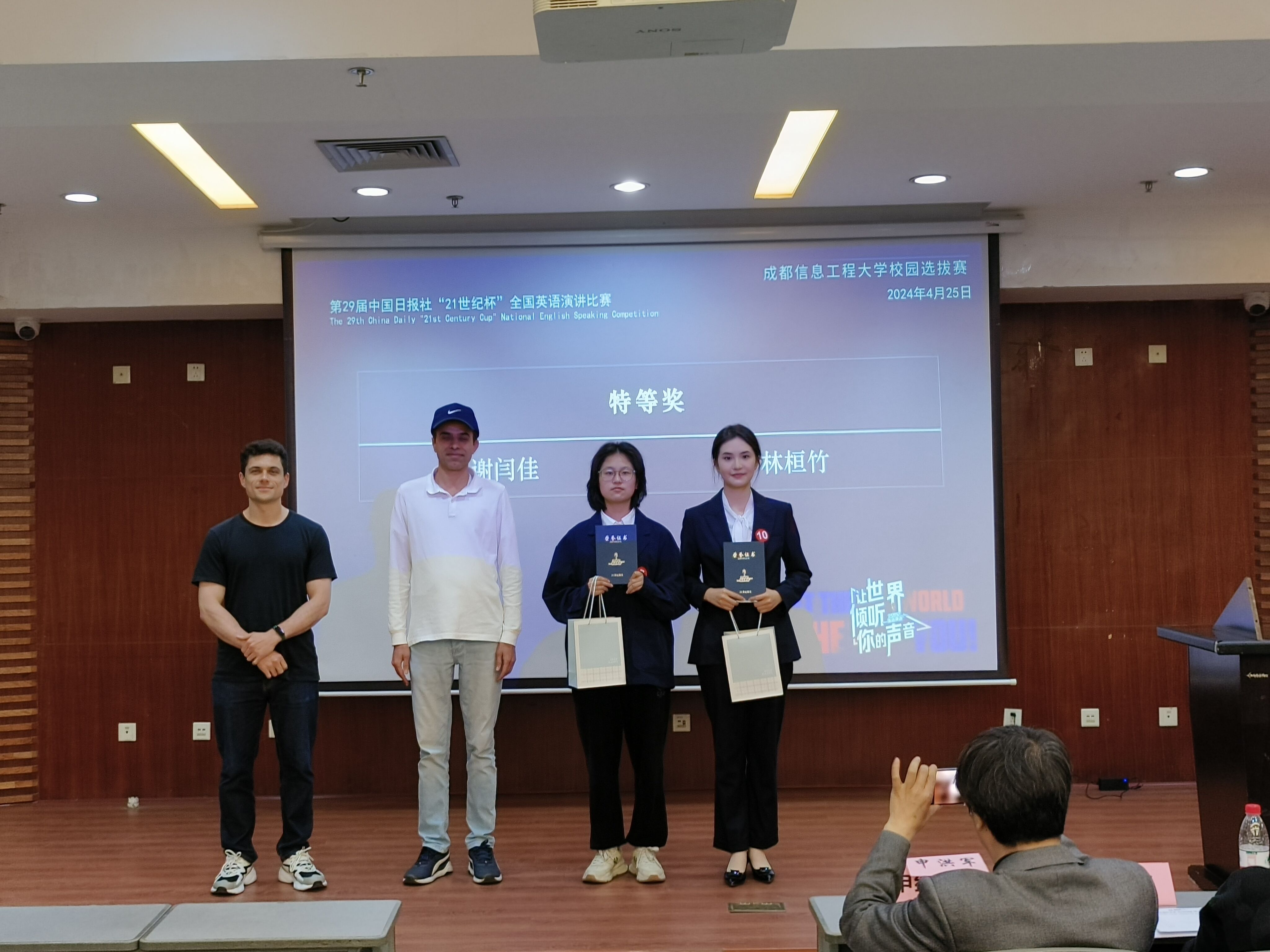 校园决赛分为定题演讲、即兴演讲、现场问答三个环节。在定题演讲环节,十名选手围绕“The Revival of Traditional Culture”(文化复兴:在现代生活中重焕新生的传统文化)这一主题分别阐述了自己的观点;在即兴演讲环节,选手们就时事热点、社会生活等话题呈现了精彩的演讲;在问答环节,选手们展现了各自的思辨能力和临场应变能力。经过近两个小时的激烈比拼,最终外国语学院的谢闫佳同学和大气科学学院的林桓竹同学获得特等奖,晋级川渝赛区决赛。