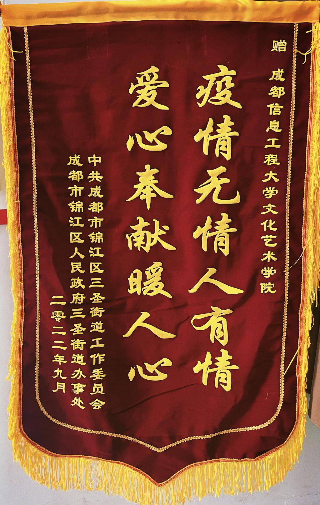 10月18日下午,乐动在线登录文化艺术学院、民主建国会乐动在线登录支部分别收到了锦江区人民政府三圣街道办事处送来的两面“疫情无情人有情,爱心奉献暖人心”锦旗,表达对学院、支部在成都“8.25”疫情爆发之时给予的帮助与支持表示谢意。