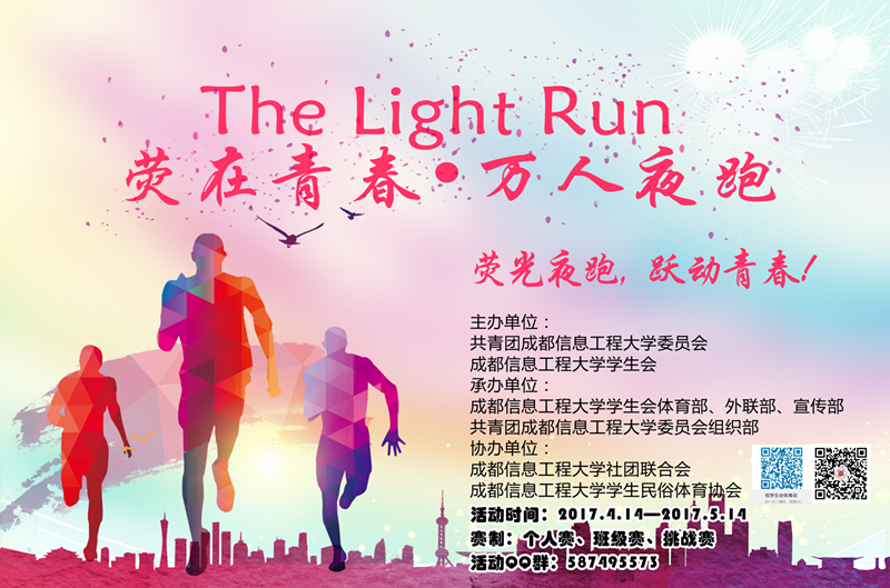 本次活动受到全校同学的积极响应,吸引了600余名个人及40余个班级分别参与到个人赛和班级赛中。校团委相关老师、全体参赛队员以及来自于学生体育类社团的领跑队员们参加此次启动仪式。来自于学生民俗体育协会的精彩空竹技艺表演为此次活动拉开序幕,随后,校团委副书记厉威成致辞并宣布“应在青春·万人夜跑”正在开始,他呼吁广大青年学生要以本次活动为契机,真正践行“走下网络、走出宿舍、走向操场”口号,坚持锻炼,在运动中增强体魄、磨炼意志,同时带动更多的同学们参与其中,让同学们体验到体育锻炼带来的无穷乐趣。伴随着起跑指令的发出,学生自行车队与学生体育类社团的作为领队带领着成信学子们开始环校荧光夜跑之旅。