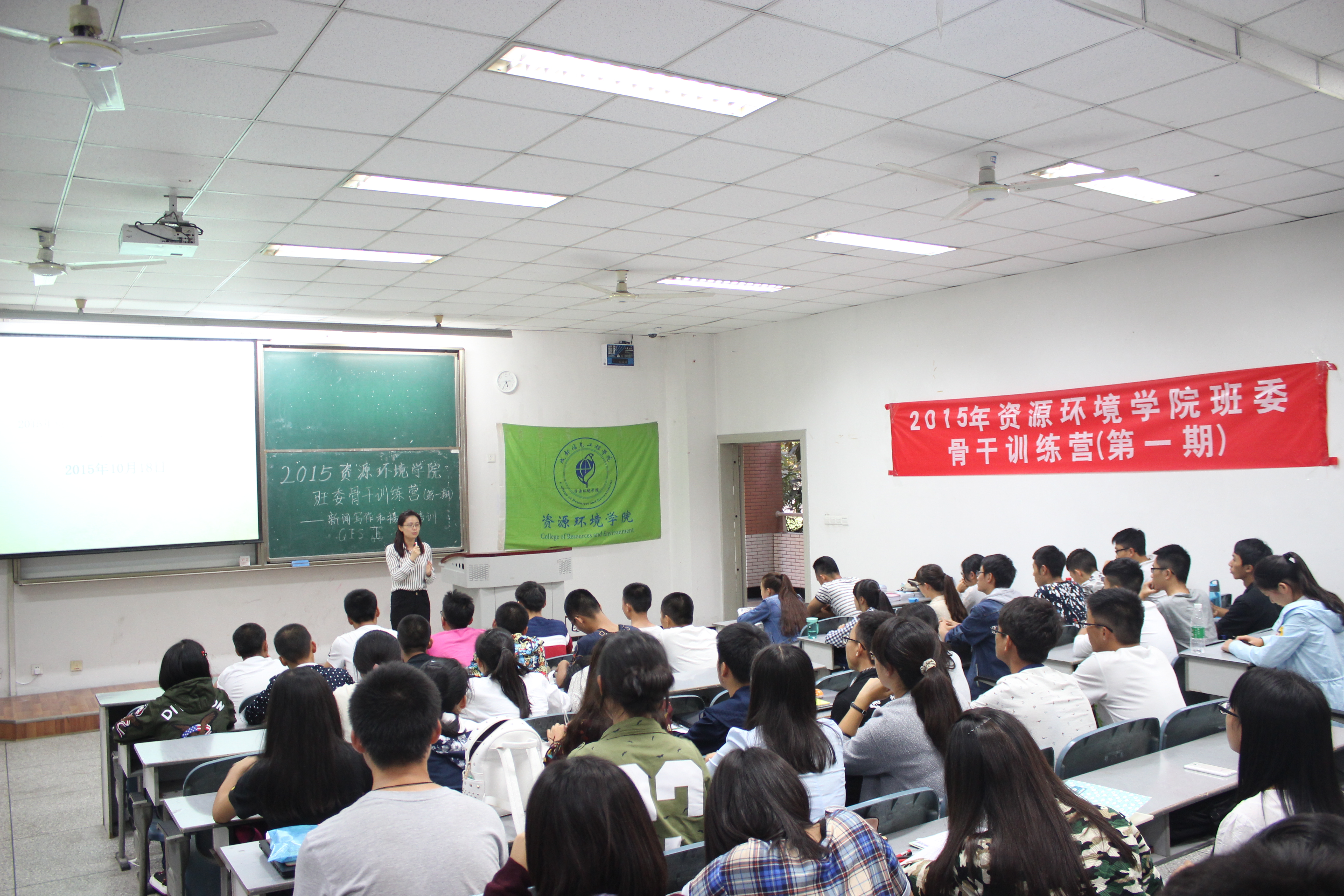 【本网讯】10月18日,资源环境学院2015级新生班委培训营(第一期)正式开训,为期一天,包括班委职责介绍,新闻写作、公文写作、视频制作、摄影技巧、PPT制作等培训,这些实用的基本办公知识,内容丰富充实。新生辅导员王燕老师全程跟踪指导,并邀请学生党支部、学生会代表组成观摩团。