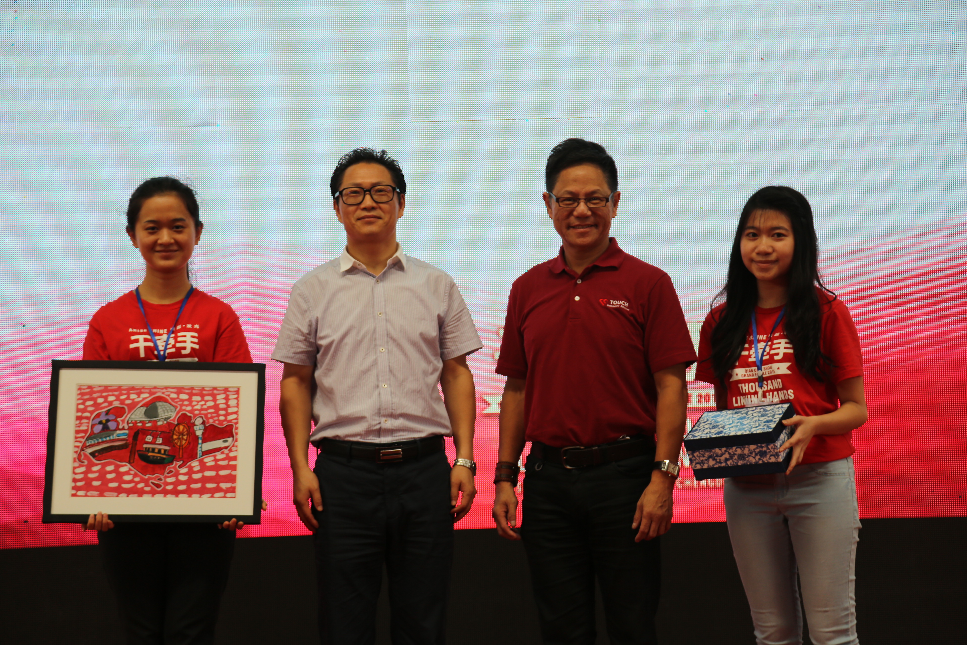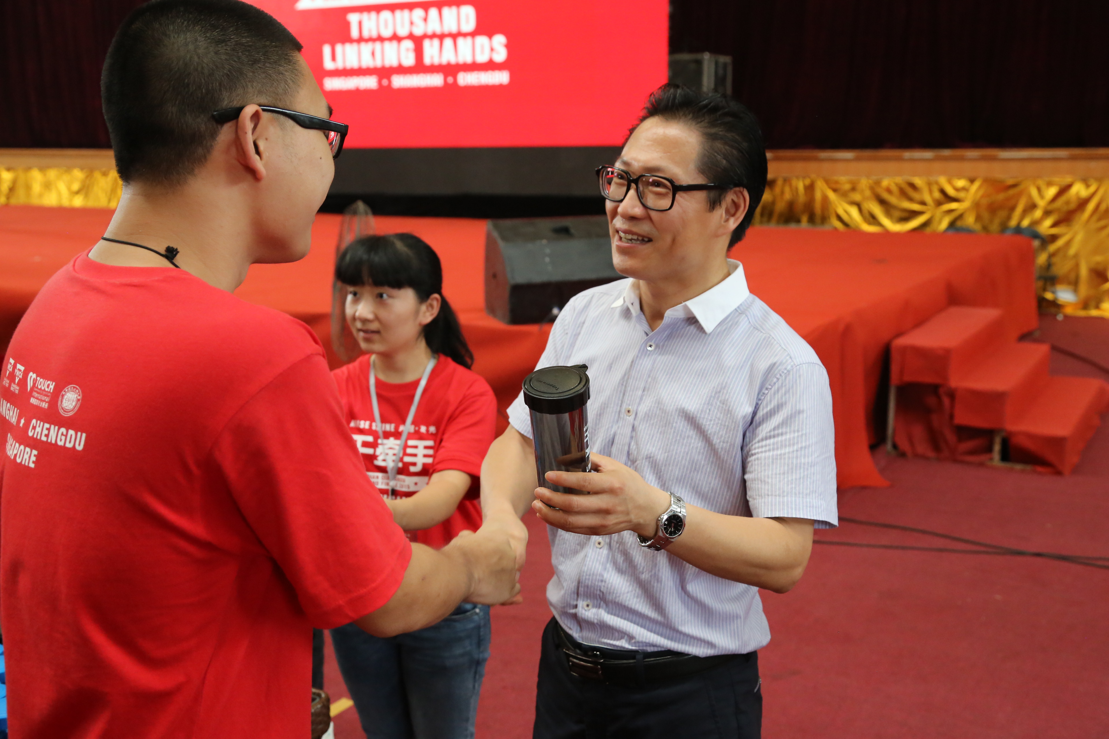 闭幕式临近结尾,成信与触爱志愿者包含热情的手拉手合唱《一起走到》,掀起本次闭幕式的高潮。同时,作为给每一位志愿者的惊喜,于世祥、邝健雄、萧树庆对在场的每一位志愿者进行慰问,并赠送“千牵手”特制水杯。在志愿者们欢乐的舞蹈中,“千牵手”夏令营公益活动圆满划上句号。