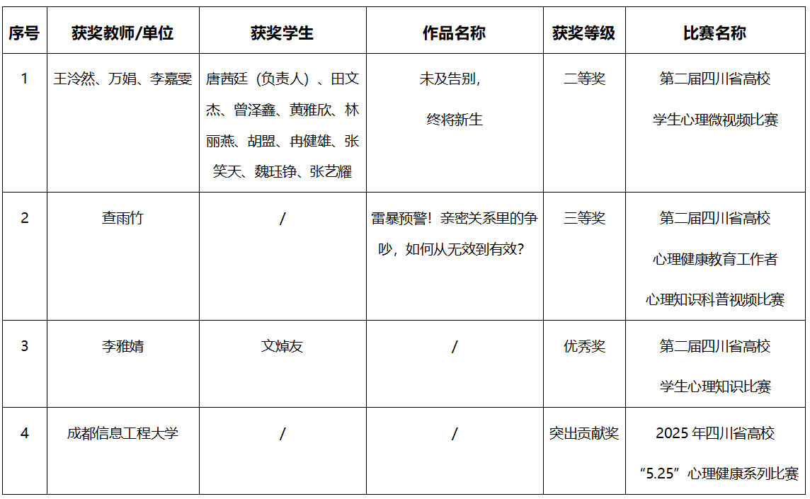 近日,2025年四川省高校“5.25”心理健康系列比赛在乐动圆满结束。此次活动由四川省心理学会高校心理健康教育专业委员会发起,乐动积极响应号召,承办心理健康教育工作者心理知识科普视频比赛。自3月赛事启动以来,学校整体部署、科学谋划,在全校范围遴选优秀作品参赛。乐动参赛师生斩获二等奖1项、三等奖1项,优秀奖1项,突出贡献奖1项,彰显了学校心理健康教育工作的扎实成效。