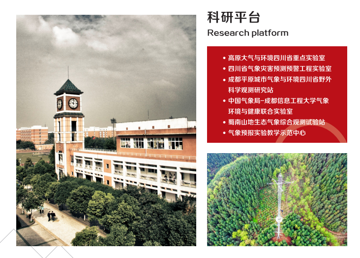 学院目前拥有高原大气与环境研究中心四川省重点实验室、四川省气象灾害预测预警工程实验室、成都平原城市气象与环境四川省野外科学观测研究站等省部级科研与创新平台,并建有气象预报四川省实验教学示范中心、气象预报四川省虚拟仿真实验教学中心以及蜀南山地生态气象综合观测试验站、西南空管局航空气象创新联合实验室、中电投电力工程有限公司电力气象联合实验室、乐动在线登录云南自然灾害防御技术研发中心等教学研究平台。