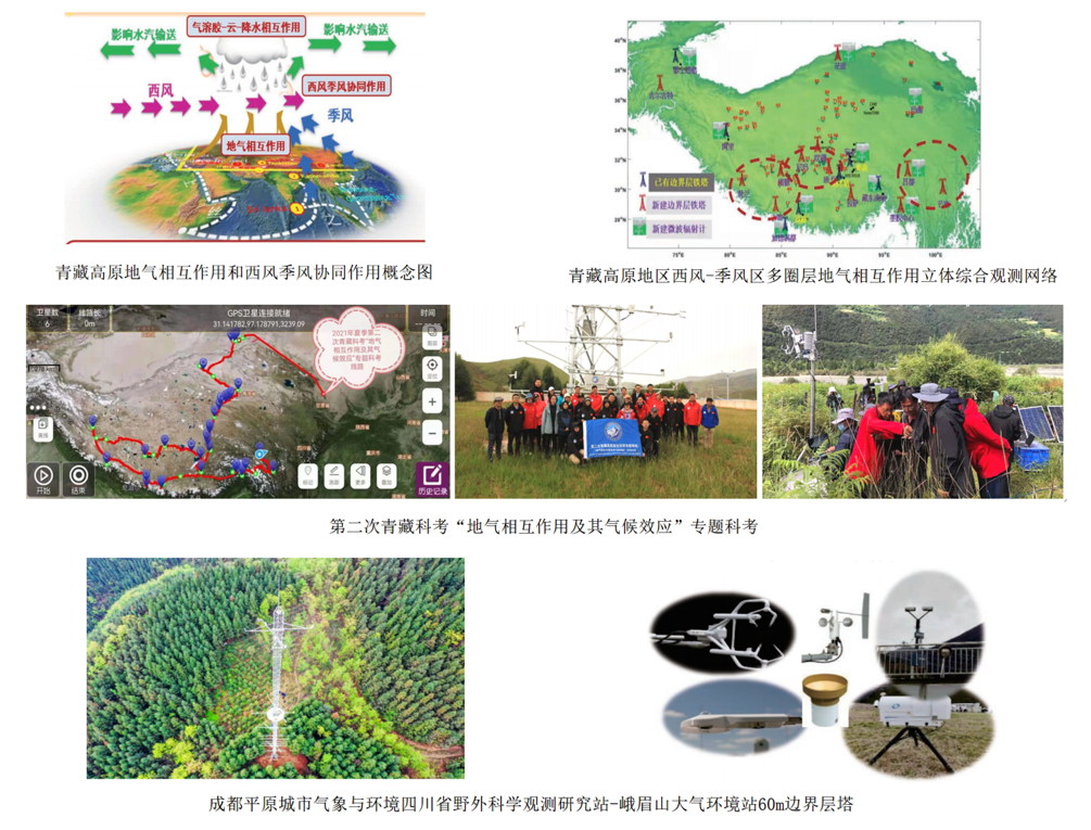 青藏高原地区地气相互作用过程对季风和西风的协同作用区的天气预报和气候预测有着直接影响,同时对亚洲水塔的形成和变化有重要影响。针对青藏高原地气相互作用研究,组建了大气边界层塔组网观测、双波段闪烁仪组网观测、风温廓线仪组网观测、微波辐射计组网观测、无线电探空系统组网观测、风吹雪组网观测、无人机组网观测和土壤温湿度组网观测等。基于协同观测结果在国内首先建立了高原热源的多元数据集,为团队和相关领域的研究提供了坚实的数据基础。
