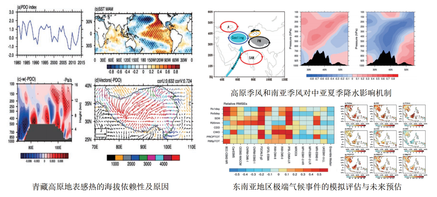 气候与气候变化方面,关注服务“一带一路”的青藏高原及其周边地区天气-气候变化研究。青藏高原地表风速和地气温差是影响高原地表感热随海拔变化的主要因子。高原高海拔地区日照时数和积雪深度可引起地气温差的变化,进而导致地表感热随海拔高度的改变。当高原季风偏强和南亚季风偏弱时,对应中亚对流层中高层气温偏低,中亚上空受异常气旋控制,导致更多的夏季降水发生。东南亚地区极端气候事件的强度和频率在2°C增暖阈值下要明显高于1.5°C,局地性的极端降水事件在高排放情景下的发生时期会更加集中。