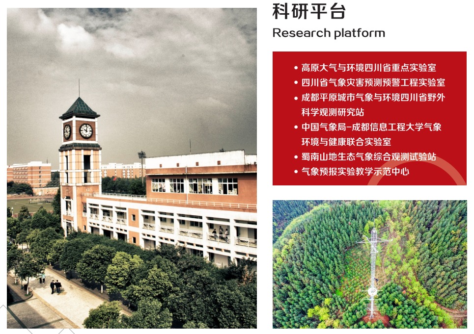 学院拥有高原大气与环境研究中心四川省重点实验室、四川省气象灾害预测预警工程实验室、成都平原城市气象与环境四川省野外科学观测研究站、中国气象局-乐动在线登录气象环境与健康联合实验室等省部级科研与创新平台,并建有气象预报四川省实验教学示范中心、气象预报四川省虚拟仿真实验教学中心以及蜀南山地生态气象综合观测试验站、西南空管局航空气象创新联合实验室、中电投电力工程有限公司电力气象联合实验室等教学研究平台。