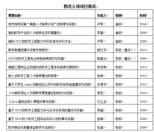 学院秉承CDIO工程教育理念,积极参与教育部实施的“卓越工程师教育培养计划”。在软件工程学科和专业建设上,积极开展教育教学改革,围绕软件工程专业人才的培养,从宏观和微观两个方面,探索培养模式的改革,课程体系的改革,具体课程的建设与改革,取得了一系列成果。