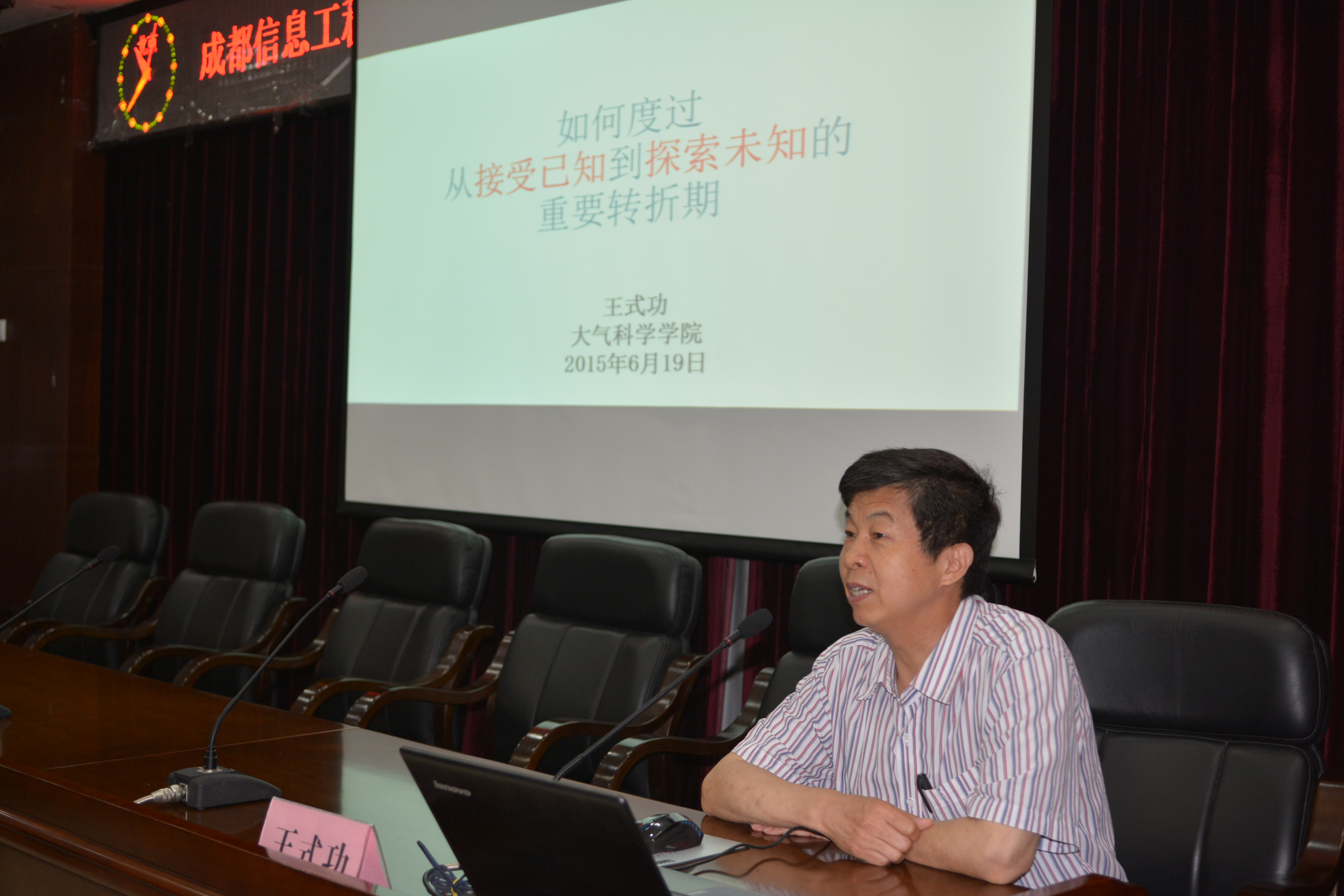 王式功以“如何度过从接受已知到探索未知的重要转折期”为题展开了2015年“成信之光”论坛首场讲座。王教授主要从四个方面与同学们分享了他从教30多年的体会。一是不同学习阶段“教”与“学”之关系变化,并指出素质教育体现在能力上;二是“三基教育”通盘抓,能力提高是关键,解释了“三基教育”即基本理论、基本知识、基本技能;三是“四种能力”的升华,想象力是灵魂。他指出“四种能力”是文献阅读能力、实验设计、数据处理和计算能力、写作能力以及想象力;四是,做好点滴小事,才可成就终生大业。他指出知识来自不断积累,理论精于持续深思,能力靠实干提升;激不活的知识是没有用的,一知半解的理论会产生误导,厌烦实践会贻误一生。最后,王世功期望同学们要既不因事大而不敢为之,更不因事小而不愿为之,只有做好点滴小事,才有望成就终身大业。