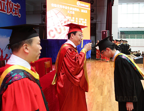 毕业典礼上,周激流、何建新向2015年省级、校级优秀毕业生授予了学士学位。