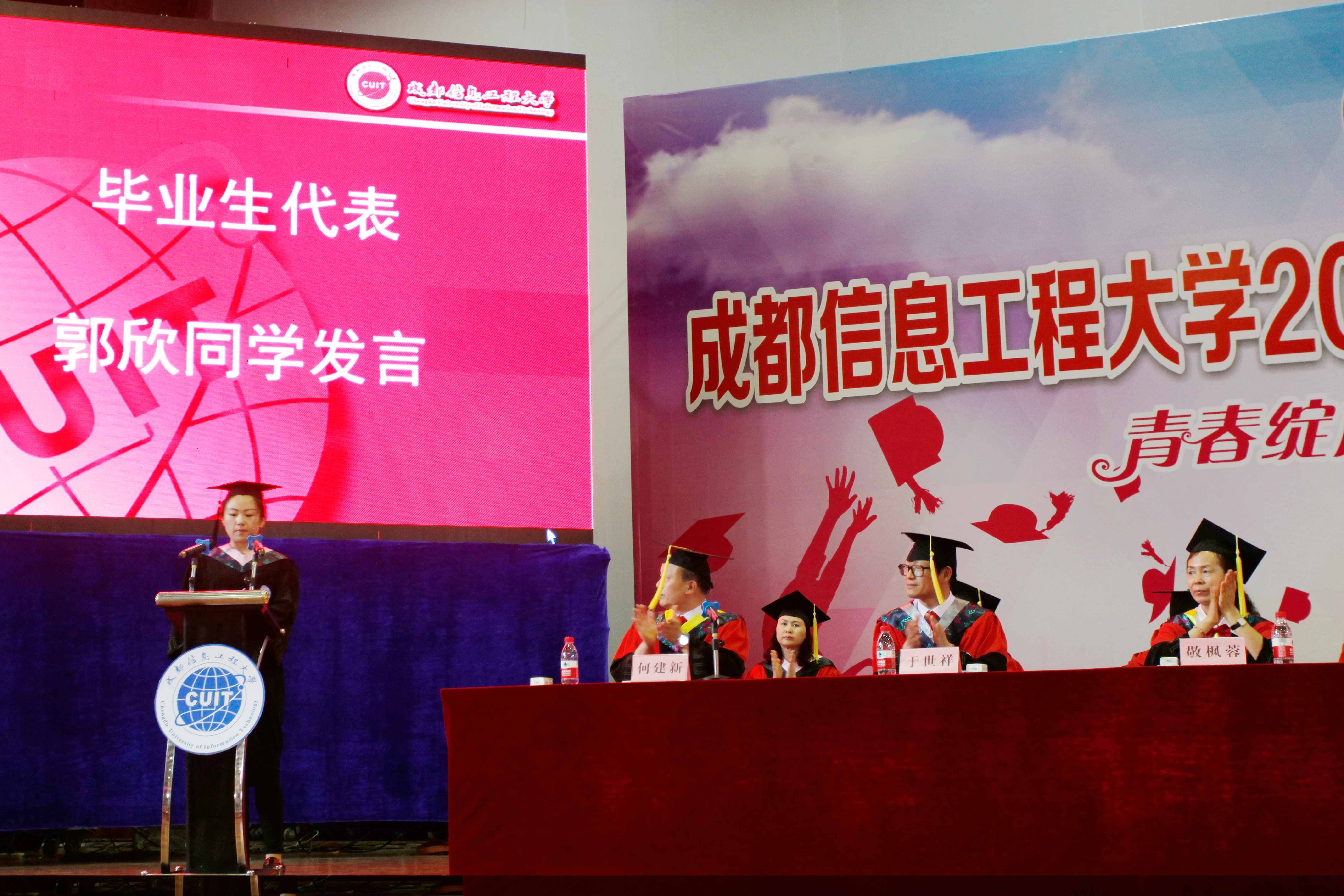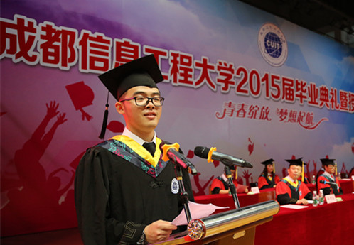 省级优秀毕业生、资源环境学院龙禹桥同学,省级优秀毕业生、文化艺术学院郭欣同学作为毕业生代表发言。四年的时光,弹指一挥间。他们深情回顾了四年的大学生活,感谢母校、老师的哺育和教导,感谢父母的默默付出,感谢朝夕相处的同学带给人生难忘的记忆。他们表示,今后无论走到哪里,永远都会记得自己是成信人,必将以“成于大气,信达天下”的校训作为动力,用最豪迈最稳重地步伐朝着美好的未来努力前进。