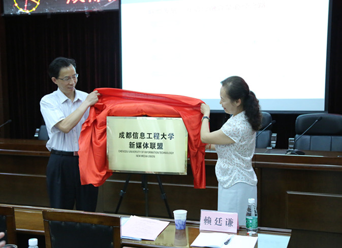 新媒体联盟成立大会上,赖廷谦、敬枫蓉共同为乐动在线登录“新媒体联盟”揭牌,这标志着学校各级新媒体平台正式结盟,开启校园新媒体联动传播、融合发展的序幕。