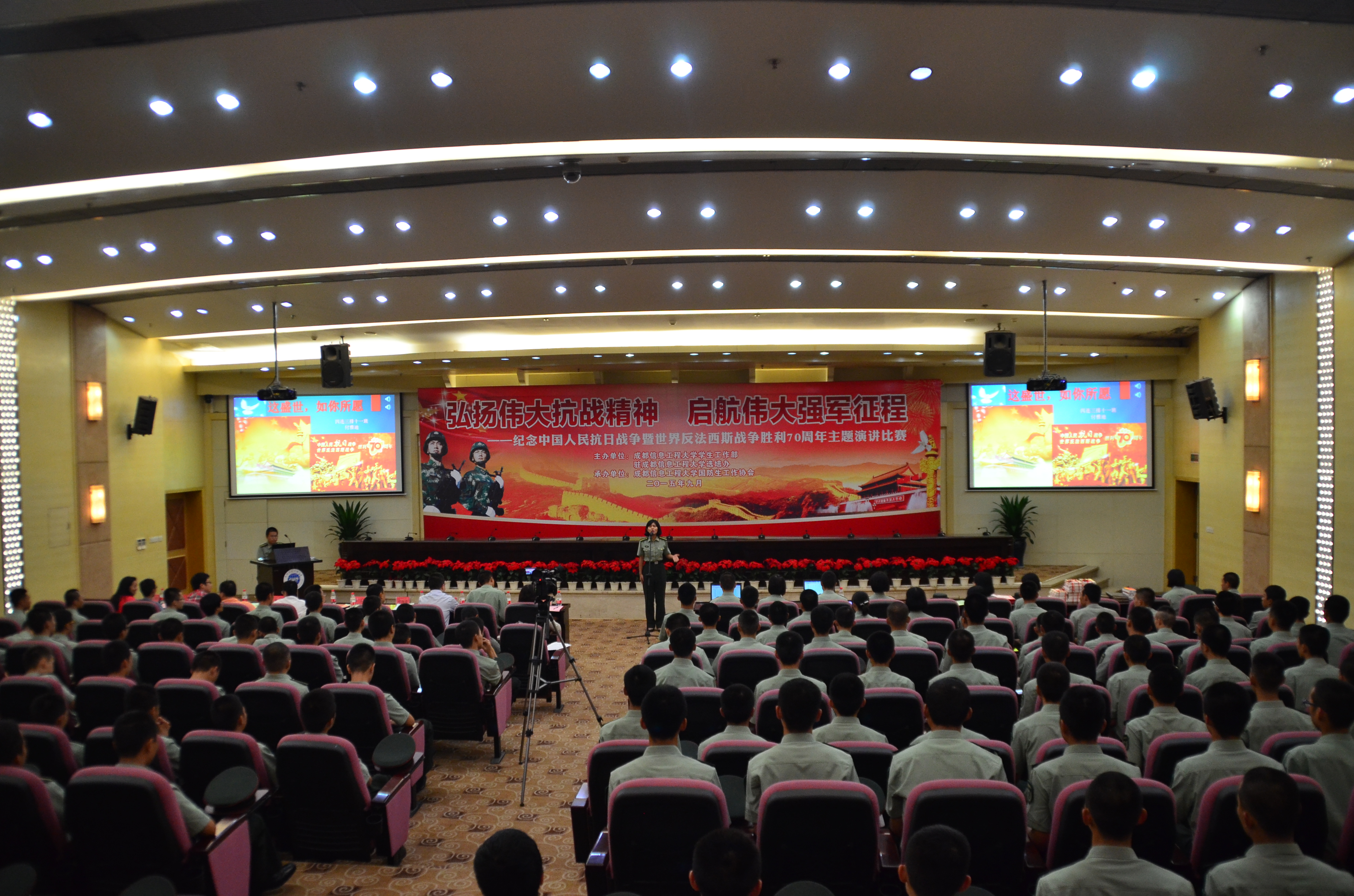 【本网讯】铭记历史,缅怀先烈,珍爱和平,开创未来。为纪念中国人民抗日战争暨世界反法西斯战争胜利70周年,9月29日晚上7:00,学校在国际会议厅隆重举行“弘扬伟大抗战精神,启航伟大强军征程”国防生主题演讲比赛。参赛选手为国防生模拟连队推选的代表。学生工作处处长戴丽红、副处长陈智勇,资源环境学院党总支书记刘绍全、电子工程学院党总支副书记彭勇、计算机学院党总支副书记朱正华,学生工作处学生管理科科长孙毅、大气科学学院国防生辅导员刘宇,学生工作处老师徐园园,驻校选培办干部担任评委。